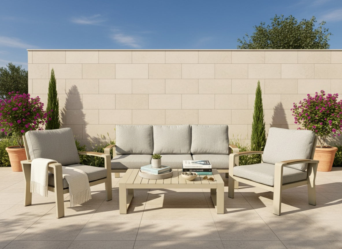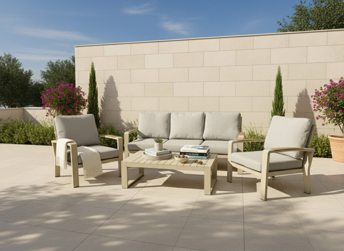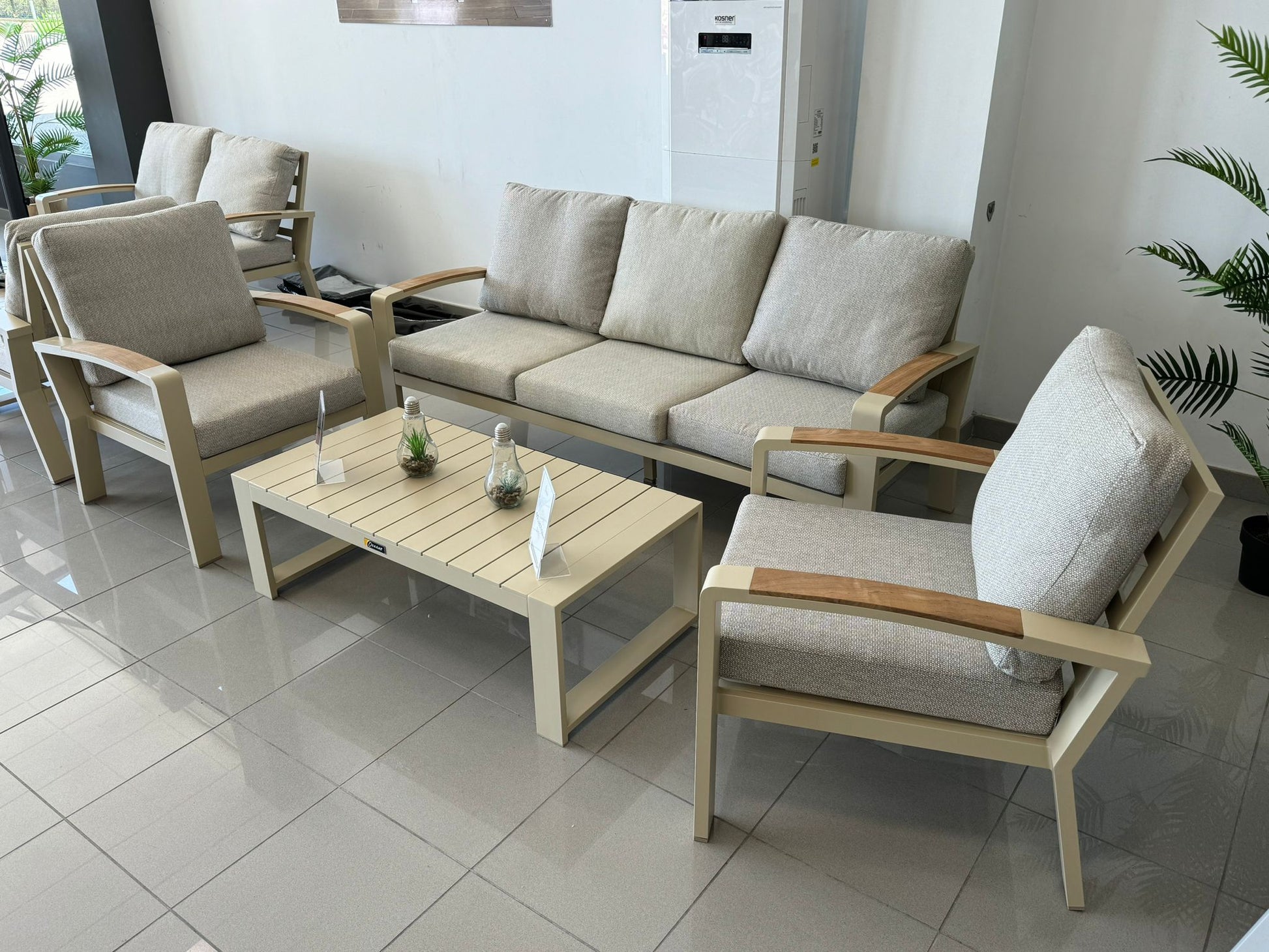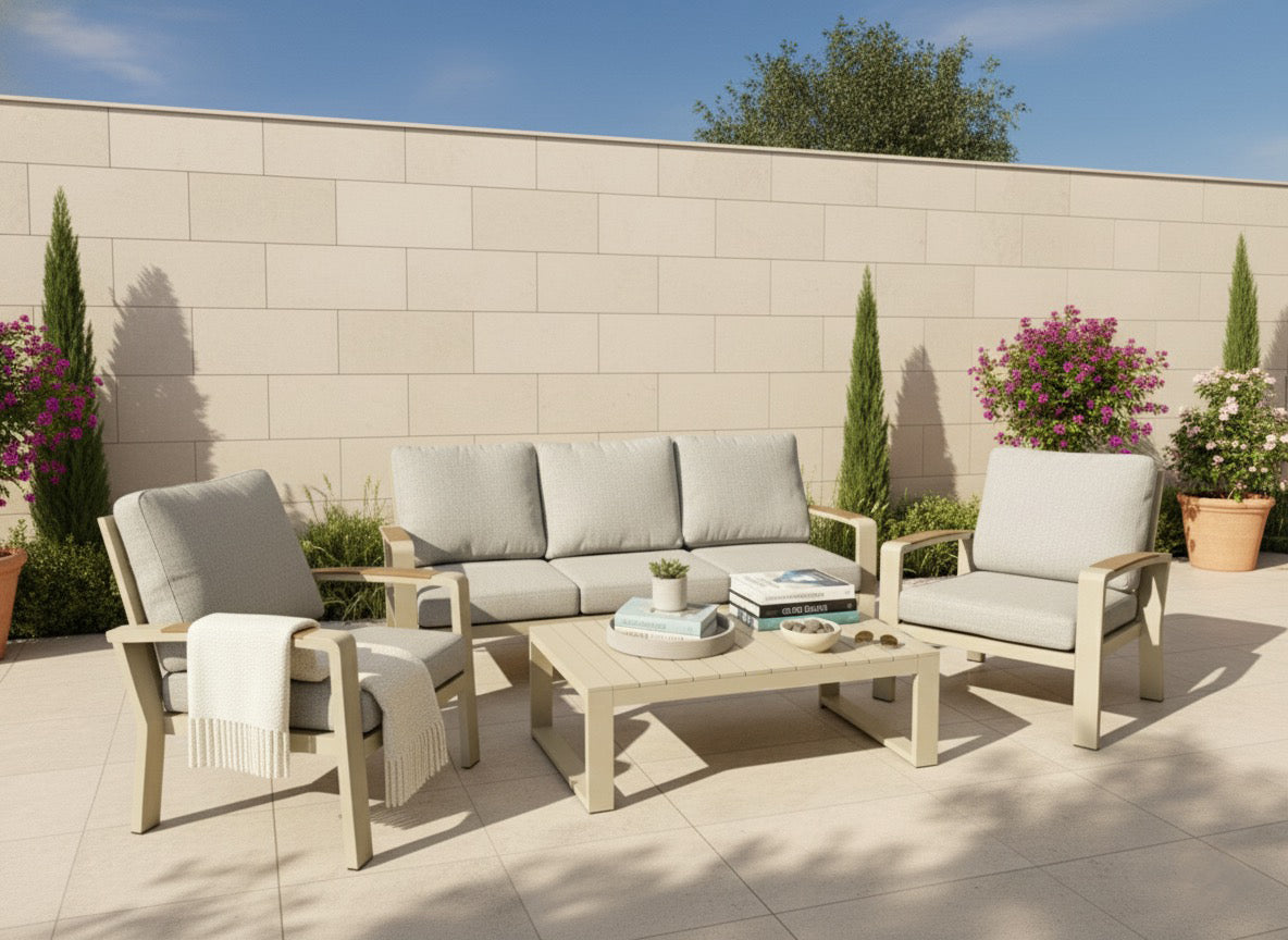 El juego de sofás de 3 plazas Bruges personifica la comodidad y la resistencia, con un diseño de respaldo alto complementado con cojines gruesos para una máxima relajación. Sus fundas de cojín resistentes al agua y la funda protectora contra la intemperie incluida garantizan longevidad y practicidad, lo que permite disfrutar del aire libre sin complicaciones. Los detalles en teca en los brazos del sofá y del sillón añaden durabilidad, ya que la teca es naturalmente resistente a la descomposición y a los insectos y garantiza años de uso, lo que la hace ideal para muebles de exterior. Ya sea en el patio, la terraza o el jardín, este juego de sofás ofrece un refugio de lujo. El espacioso diseño de tres asientos tiene capacidad para más invitados, lo que lo hace perfecto para reuniones sociales o momentos familiares acogedores. Con su combinación de estilo, comodidad y durabilidad, el juego de sofás de 3 plazas Bruges transforma cualquier espacio al aire libre en un acogedor oasis. Relájese con estilo y disfrute de momentos de ocio con esta elegante y práctica incorporación a su sala de estar al aire libre.