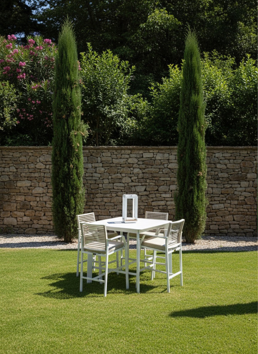 This elegant high-quality bar set is crafted from premium powder-coated aluminium, ensuring durability, weather resistance, and long-lasting beauty. Combining modern aesthetics with exceptional comfort. The tall slatted bar table offers ample space for dining, entertaining, or casual drinks, while the matching bar stools include supportive armrests and comfortable cushions for an elevated seating experience. Perfect for patios, terraces, or garden bars, this set adds sophistication and functionality to any setting. Built for strength and style, it’s the ideal choice for luxurious outdoor living.